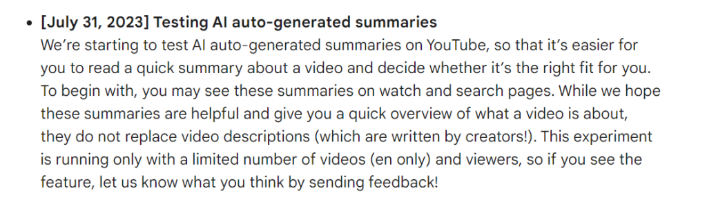 2023年7月31日,Youtube在其官方的帮助社区更新的最新测试通知显示,Youtube正在测试使用AI技术自动生成视频内容总结。