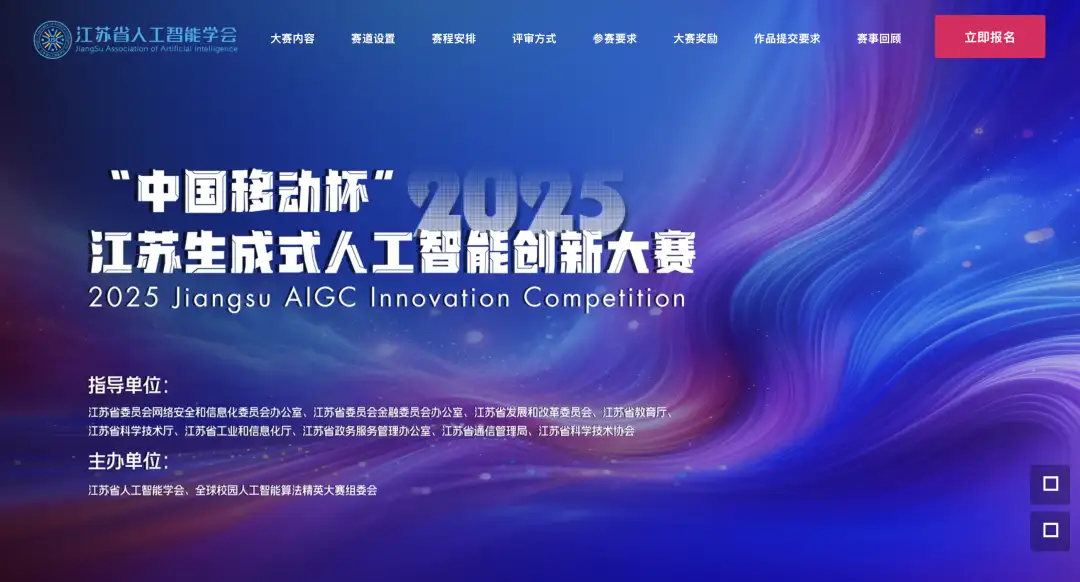 为贯彻落实党的二十届三中全会精神,激发生成式人工智能技术创新活力,挖掘新作品、新应用、新场景和新模式,推动产业融合发展,促进人才培养与选拔,提升我省在生成式人工智能领域创新力、竞争力和影响力,江苏省人工智能学会现组织举办“中国移动杯”2025江苏生成式人工智能创新大赛(以下简称AIGC大赛)。